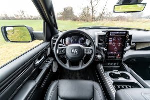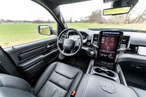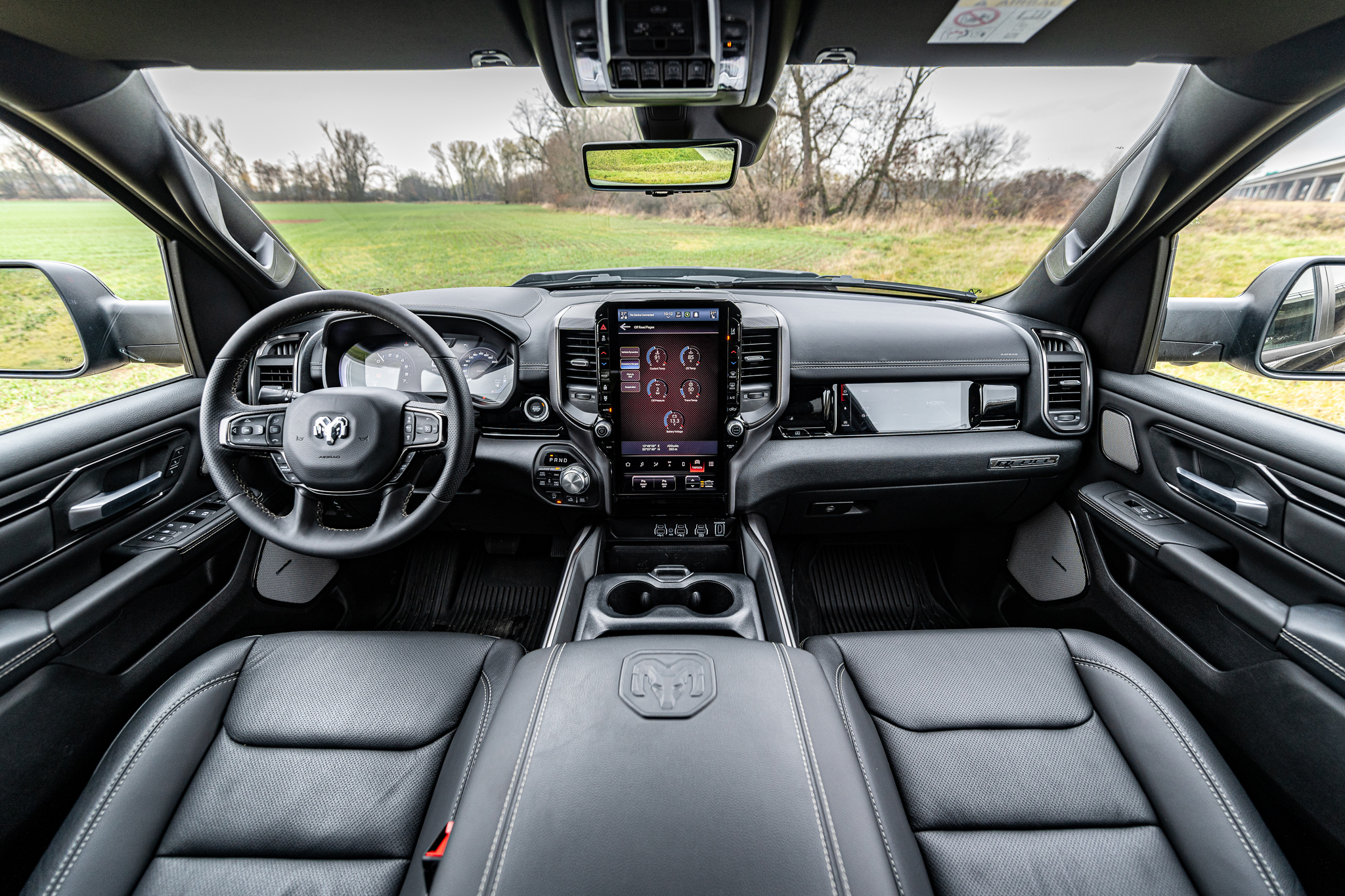 Já s autem ale v terénu nejezdil. Jasně, mohl bych, pneumatiky pro to byly jako dělané, zbytek auta také. Já byl však zvědavý na běžný život. Znáte to, jednou za čas jedete ať už pracovně, či za zábavou, do lesa. Ale ve většině času chcete nasednout, usadit děti, vyhřát si sedačku a pustit si rádio. A v klidu jet. To RAM 1500 umožňuje naprosto v pohodě, dokonce dozadu dáte tři dětské sedačky s isofixy. Dopředu však ne, což je škoda, protože před spolujezdcem je displej s vlastním HDMI vstupem a okruhem bluetooth. Protože proč by ne, že ano.