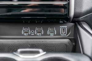 Sedačky jsou vyhřívané i odvětrávané. Někdo by se mohl bát, že americké auto bude mít problém s evropskými standardy. U rádia vás uklidním, normálně funguje. Bezdrátové Apple CarPlay a Android Auto také, to je v dnešní době hodně důležité. Jen zásuvky v autě a na korbě jsou na 115 V a ne na našich 230 V. Plus s jinou zásuvkou, samozřejmě.